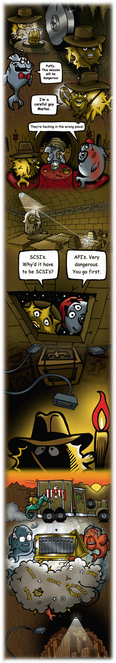 Every 6 months the OpenBSD project has the pleasure to release our software with artwork and a matching song. Theo and some other developers mutate a theme (from a classical setting, a movie, or some genre) into the fishy world of Puffy, to describe some advance, event or controversy the project went through over the previous six months. To match the art released with the historical CD sets, we joined up with some musicians we know to make at least one song.